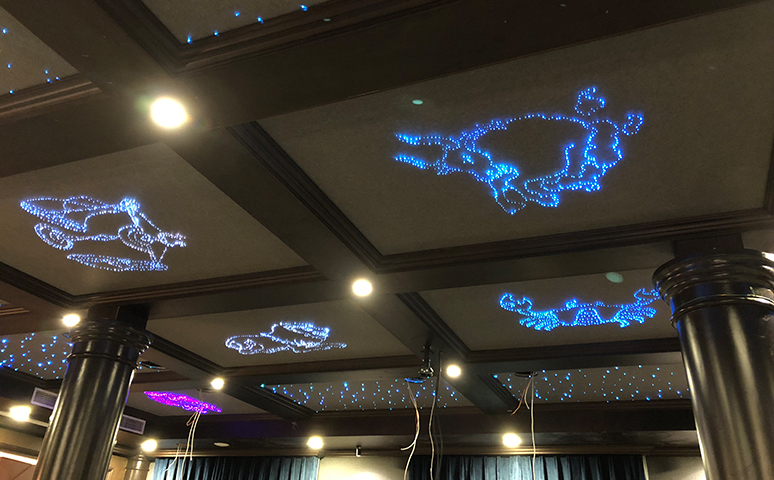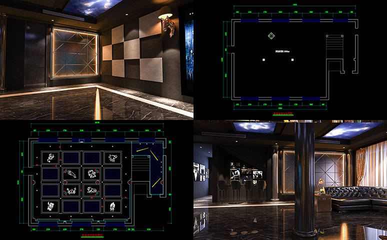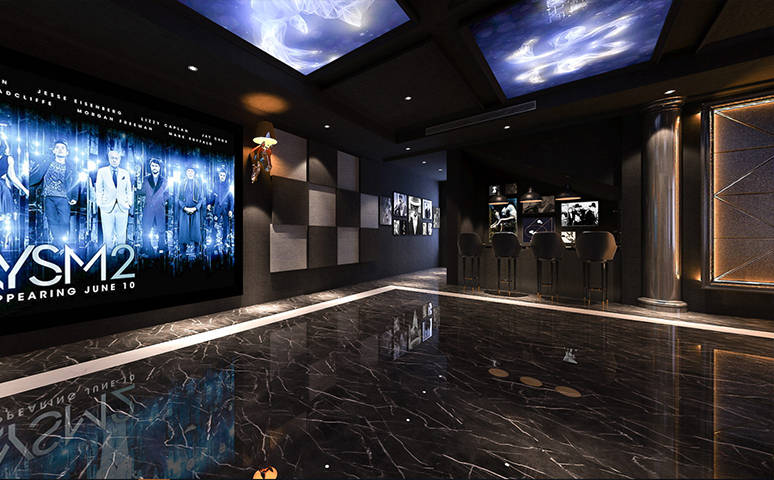 沉稳大气,多功能娱乐会所改造,私人影院+KTV定制安装案例。星空顶的设计结合顶梁与立柱结构,由8组星象和满天星组成小区域星空,灰色系星空底板,木作线条分隔装饰,结合边吊,与地面深色大理石相呼应,沉稳庄重。过道区的星空不时有流星闪过,流动的元素映衬吧台区。