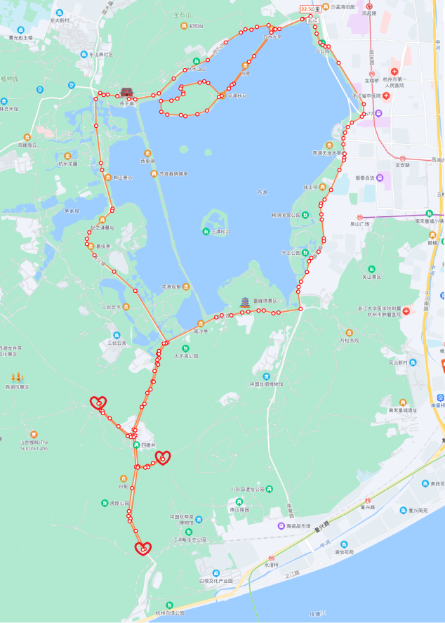 参考路线:少年宫→北山街→断桥→白堤→孤山路→孤山后路→白堤→断桥→北山街→湖滨路→南山路→虎跑路→满觉陇路→虎跑路→莲花峰路→虎跑路→杨公堤→北山街→少年宫