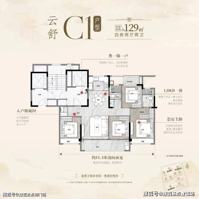 四开间朝南,南向面宽达到13.4米,连接客厅和次卧的阳台面积约11个平方米.南向的主卧和不连阳台的次卧带飘窗.四个房间的空间都足够大,其中主卧约有18平方米.很多项目的初级改善户型,云涌之江做出了终极改善的程度.