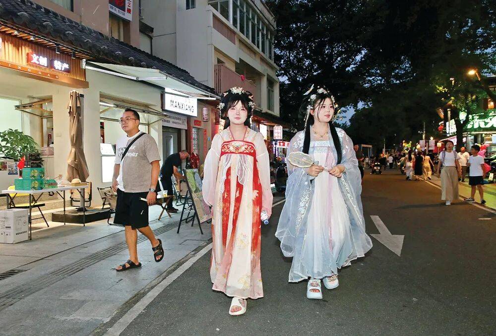 这里早已成为文艺青年的聚集地,游人穿梭于古今之间。10家汉服妆造室提供从妆造、摄影到后期的一条龙服务,身着汉服的游人衣袂翩跹,与古巷月光相映成趣,宛如穿越千年的邂逅。沉浸式体验让游客与历史文化亲密接触。