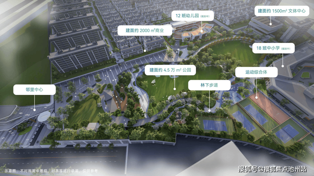 整个项目由两宗地块组成,占地约425亩,总建筑面积约48万㎡。是一座涵盖约4.5万㎡公园、幼儿园、九年一贯制学校、文体中心、邻里中心等复合业态的超大“公园城市”。
