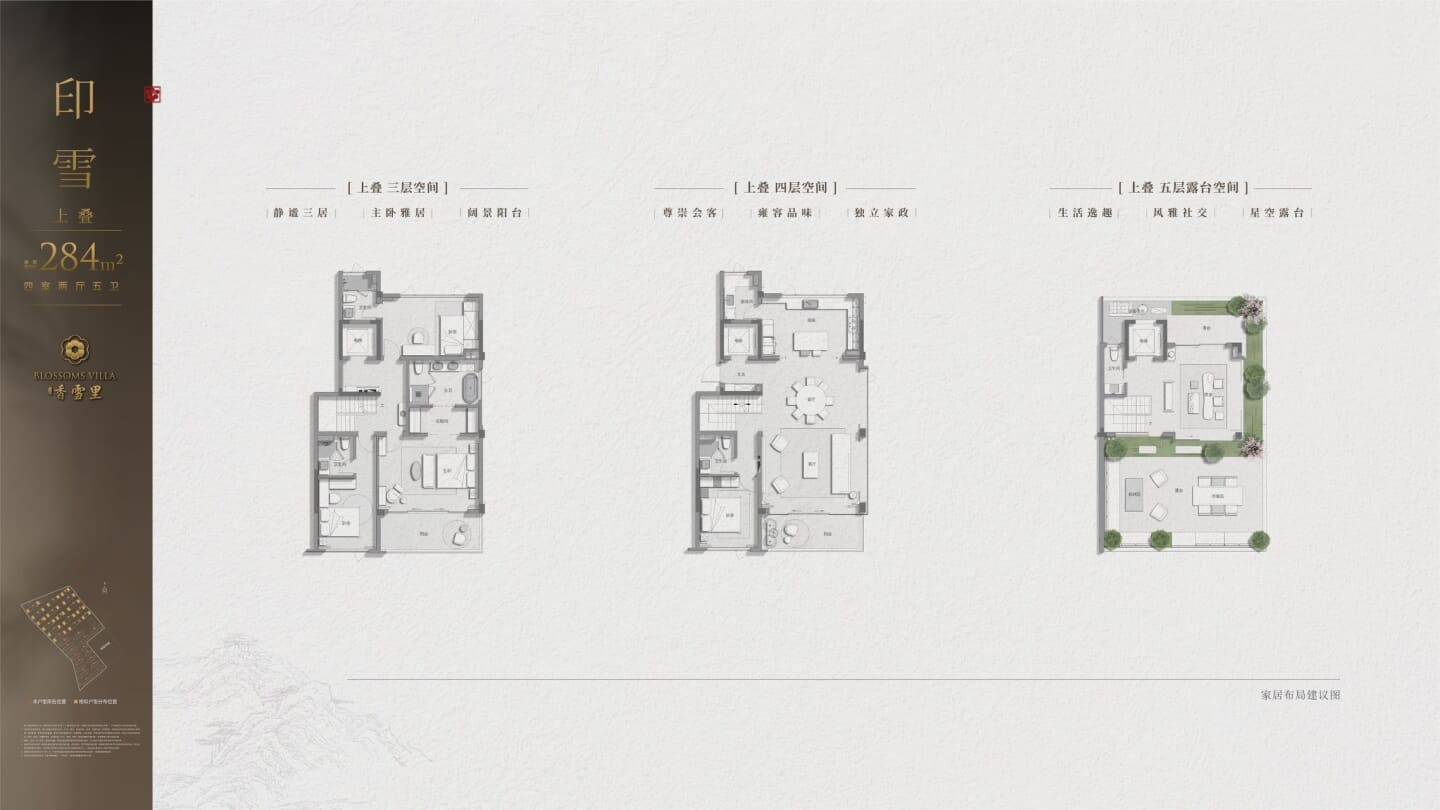 上叠户型:建面约284㎡,北花园入户且电梯可直达露台层,总价约545-691万/套叠排均为私梯入户,首层层高约3.4米,得房率高达82%