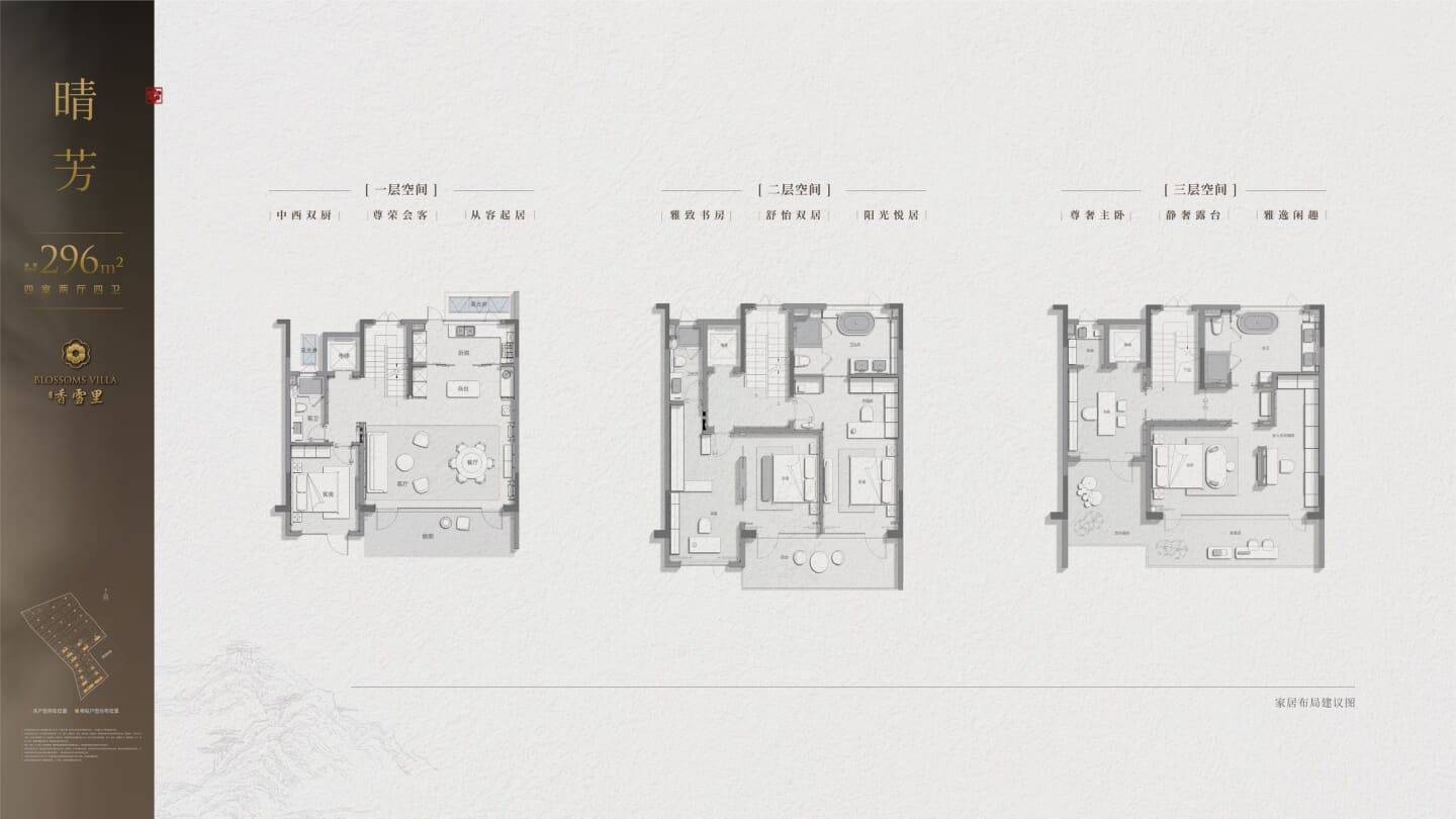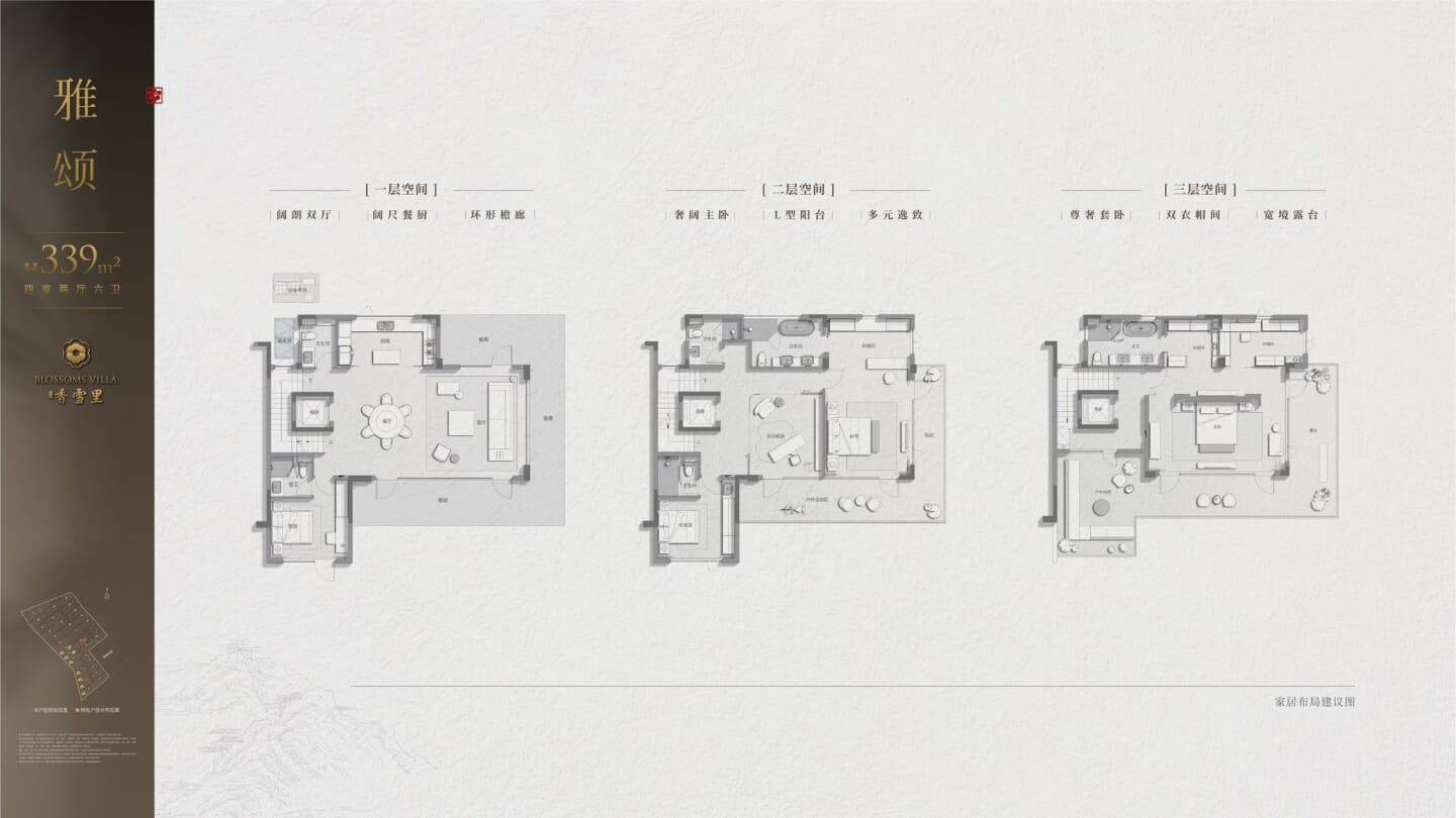 建面约296-339㎡,地上三层设计,首层层高约3.5米,搭配大面积落地窗