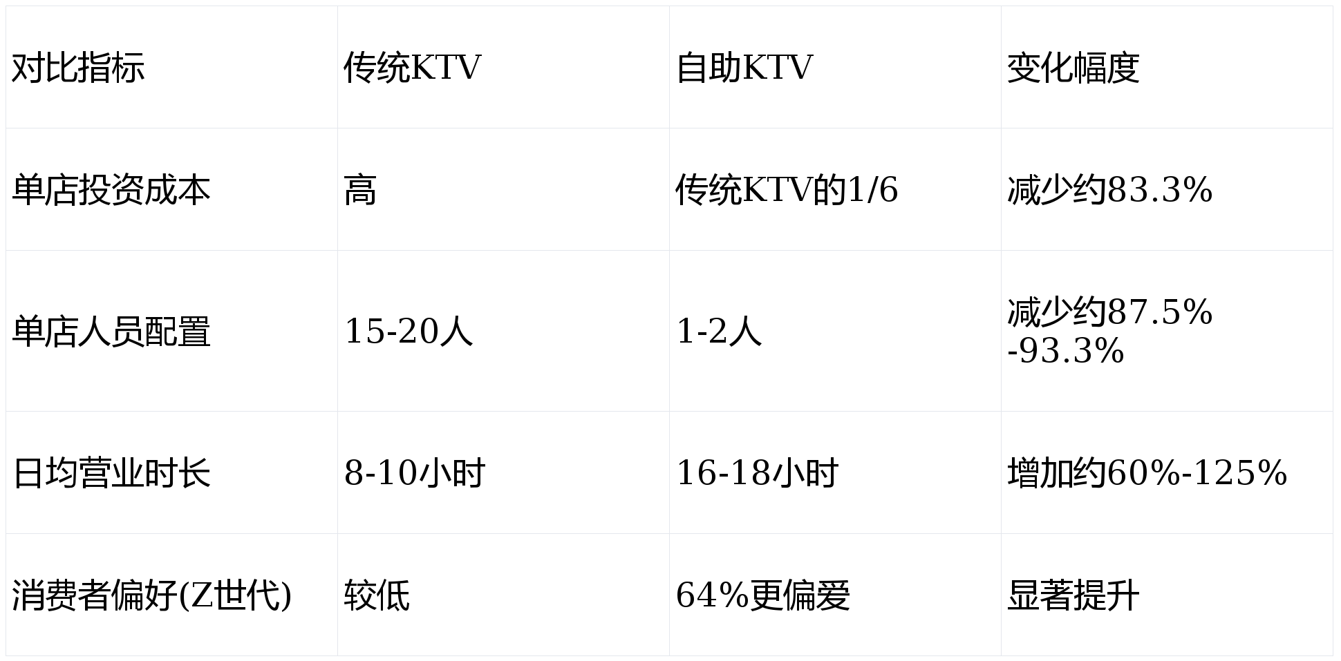 效率的提升不仅体现在时间维度上,更反映在成本结构中。自助KTV的单店投资成本仅为传统KTV的六分之一,而人员配备从15-20人锐减至1-2人,这样的人效比改变,正在重塑整个行业的盈利模型。