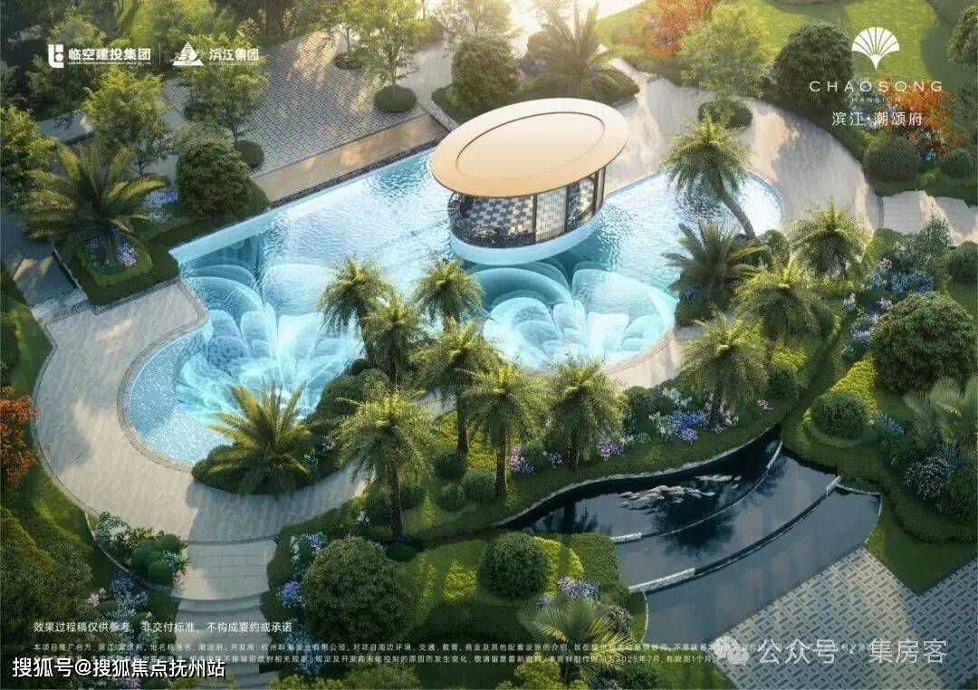 四大主题花园、微度假星光水池与九潮纳客架空层泛会所。潮颂府项目景观效果图