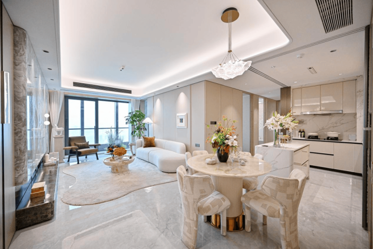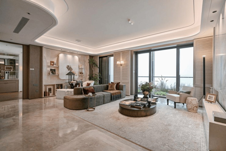 1、【巨幕景观客厅】最宽的客厅面宽约5.65m,和市面上180平左右的客厅面宽差不多。客厅大面宽带来阳光全天候洒满客厅,每一天都沐浴在温暖的阳光中。