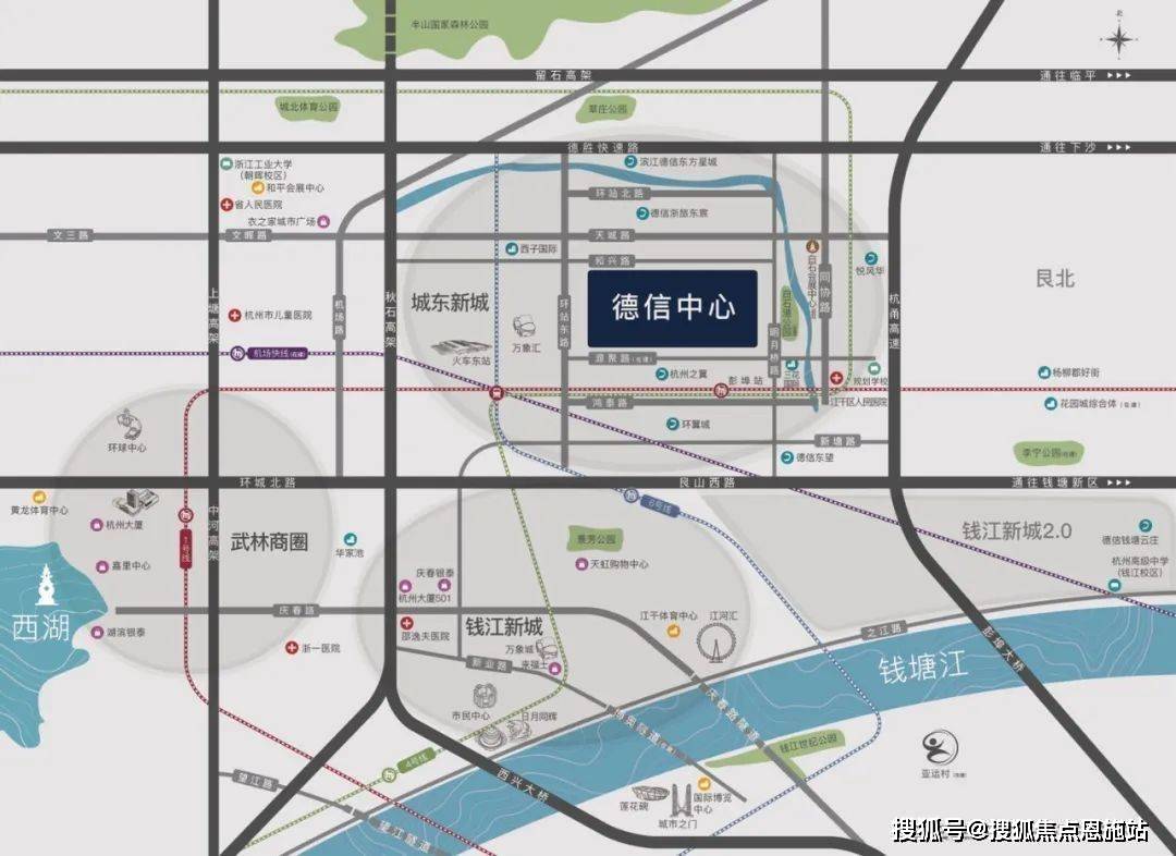 德信中心与杭州东站直线米,与杭州之翼、环翼城等组成约62万方德信商业集群,成为总部企业发展基地。坐揽万象汇、东站电子国际、港龙游乐城等商业,人潮所向,造就区域内难得一见的门户封面。