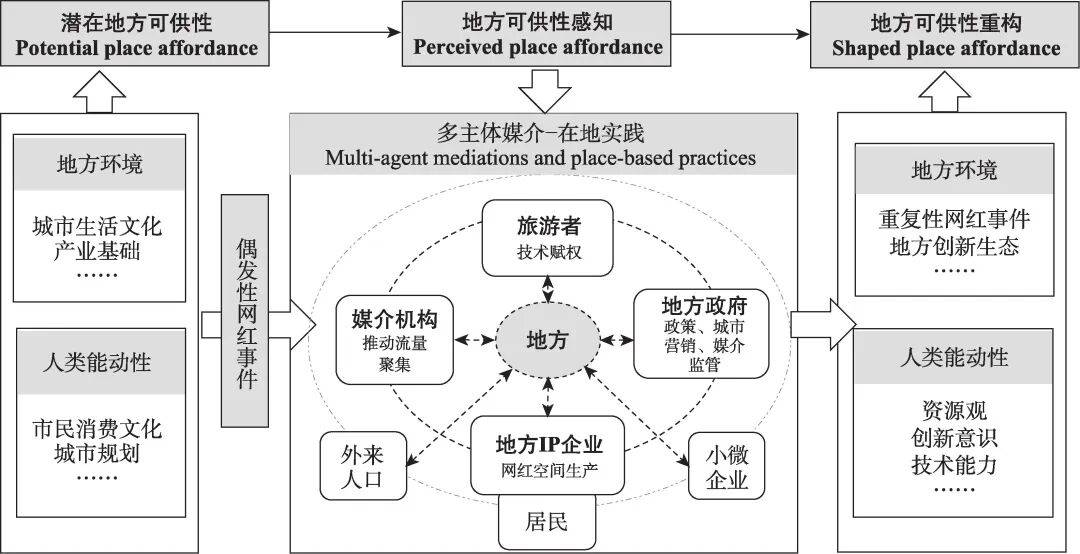 [3,6]。本研究从可供性角度创新性阐释网红城市地方营造过程和机制,拓宽当前对旅游目的地地方营造与数字媒介关系的研究视角,揭示社交媒体在城市实践可能性、原生文化资源挖掘和空间意义重塑中的作用,进而在学理层面回应网红城市从网红向长红转化的问题。一方面,本文从城市整体网红化出发,丰富了当前以小尺度网红空间建构为主的研究[8,11,69],深化了对网红城市建构中政府、企业、旅游者、媒介机构、居民等多主体作用的理解;另一方面,有别于单纯将社交媒体视为消费者符号互动平台[18,70]、地方表征或线],本研究认为,社交媒体作为结构性要素激活城市地方文化资源可见性、重塑不同行动者之间互动关系,从而引导具有迭代性的地方营造。此外,本研究通过建构“潜在地方可供性-地方可供性感知-地方可供性重构”框架,为可供性理论在数字旅游情境中的运用提供新的见解。以往运用可供性理论时更加注重环境或社交媒体属性所带来的物质空间层可供性[59,71]