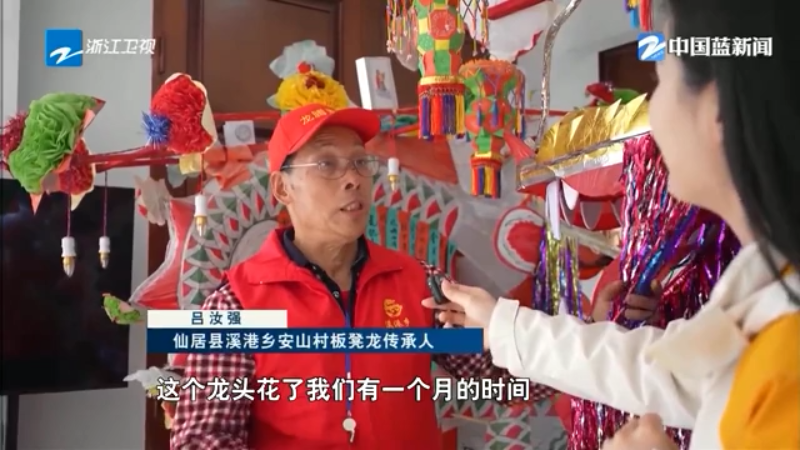 溪港乡安山村板凳龙传承人 吕汝强:整个龙头花了我们有一个月的时间,龙头重量有三百多斤,需要五个人来抬。